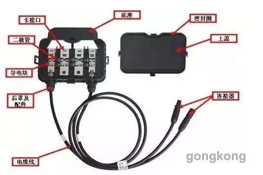 盒体、线缆及连接器三部分构成; 盒体包括:盒底(含铜接线柱或塑料接线柱)、盒盖、二极管; 线缆分为:1.5MM2、2.5MM2、4MM2及6MM2等这几种常用的线缆; 连接器分为两种: MC3与MC4两种; 二极管型号: 10A10、10SQ050、12SQ045、PV1545、PV1645、SR20200等 二极管封装有两种:R-6 SR 263